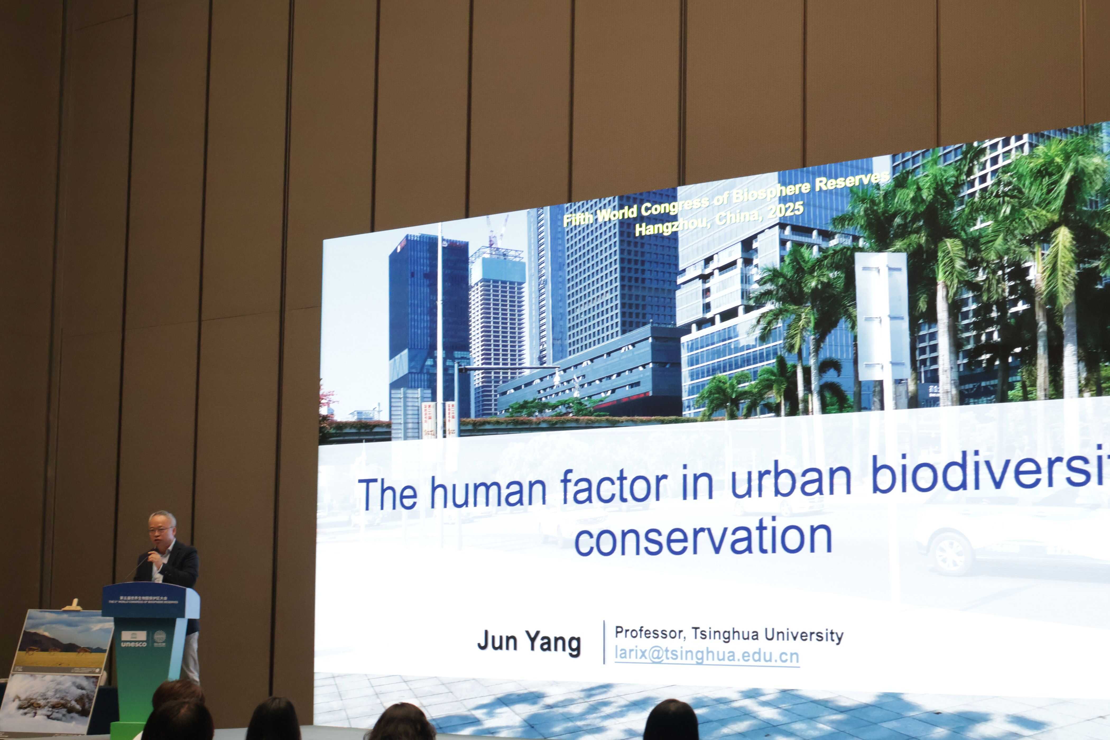 清华大学杨军教授作题为“The human factor in urban biodiversity conservation”的报告。他从家乡常见树种变迁入手,深入浅出地阐释了城市边界、人类管理与公众认知对城市生物多样性的影响,并对比了中外相关研究的异同。杨军强调,人类是塑造城市生物多样性的关键力量,应加深对人类行为影响的理解,推动人与生物互益,减少人与生物冲突。